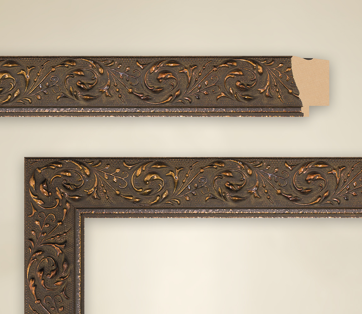 Avec le modèle Minou, la série de cadres Tapestry présente un cadre en bronze avec des ornements qui est un cadre de peinture simple mais impressionnant en termes de couleur et de forme. À 32 mm, le cadre fait saillie dans la pièce à son point le plus élevé sur le bord extérieur. Sa largeur totale est de 40 mm, sur laquelle les concepteurs ont intégré deux zones. La majeure partie de la vue de dessus est occupée par la bordure supérieure épaisse avec ses ornements. Du mur, cette partie de la barre en bois véritable entre en scène comme une langue qui pivote vers le haut puis s'aplatit vers le bas à un angle peu profond. L'arrière-plan montre un ton de bronze brun mat, à partir duquel des nuances claires brillent parfois. De petits points métalliques, rappelant une gravure sur cuivre et étalant une magnifique structure, y sont appliqués, initialement maintenus en arrière-plan. Ils ont reçu une couleur bronze clair brillant ainsi que les autres ornements ajoutés. Les créateurs ont choisi ici des éléments floraux qui présentent des vrilles très délicates, dont les extrémités se terminent ici et là en bourgeons bulbeux. Néanmoins, leur apparence générale reste très fine, car vous avez habilement laissé beaucoup d'air entre les tresses. Une double barre étroite et simple assure la fin de l'image.