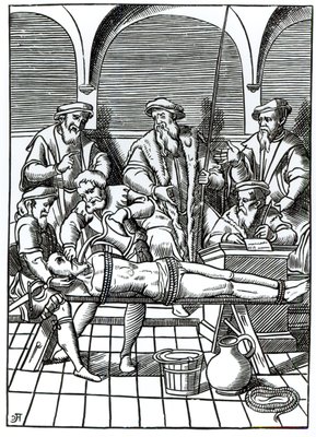 Torture à l'eau, d'après une gravure sur bois dans "Praxis Rerum Criminalium" de Joos de Damhouder (1507-81), publiée à Anvers.(Water torture, after a woodcut in 'Praxis Rerum Criminalium' by Joos de Damhouder (1507-81) published Antwerp)(after) Dutch School |