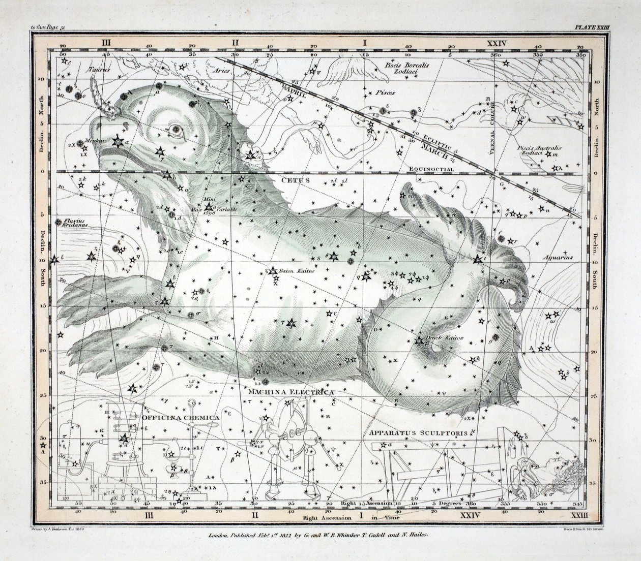 Les Constellations (Planche XXIII) Cetus, Officina Sculptoris, Machina Electrica, Fornax Chemica, de 'A Celestial Atlas' par Alexander Jamieson, pub. Londres 1822(The Constellations (Plate XXIII) Cetus, Officina Sculptoris, Machina Electrica, Fornax Chemica, from 'A Celestial Atlas' by Alexander Jamieson, pub. London 1822 (hand coloured engraving))Alexander Jamieson |