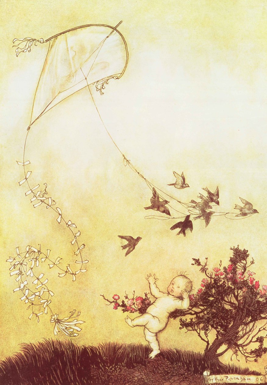 Cerf-volant dans les jardins de Kensington de 'Peter Pan dans les jardins de Kensington' par J.M. Barrie, 1906(Kite Flying in Kensington Gardens from 'Peter Pan in Kensington Gardens' by J.M. Barrie, 1906)Arthur Rackham |
