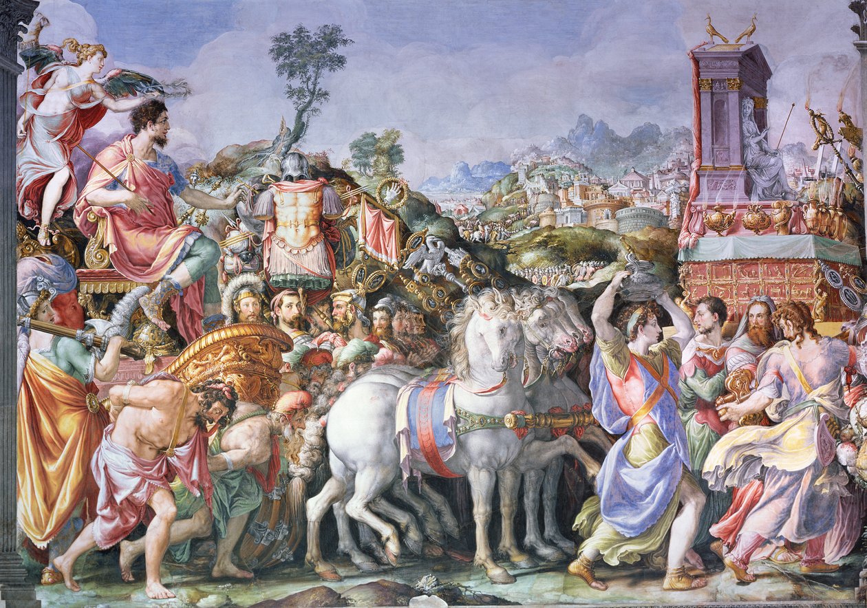 Le Triomphe de Marcus Furius Camillus (447-365 av. J.-C.), de la Sala dell'Udienza, 1545 (post restauration)(The Triumph of Marcus Furius Camillus (447-365 BC), from the Sala dell'Udienza, 1545 (post restoration) (see 85158))Francesco de Rossi Salviati Cecchino |