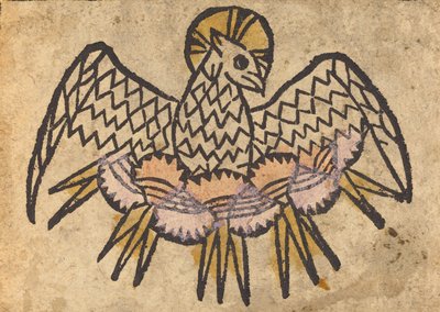 woodcut, hand-colored in yellow, lavender, and rose