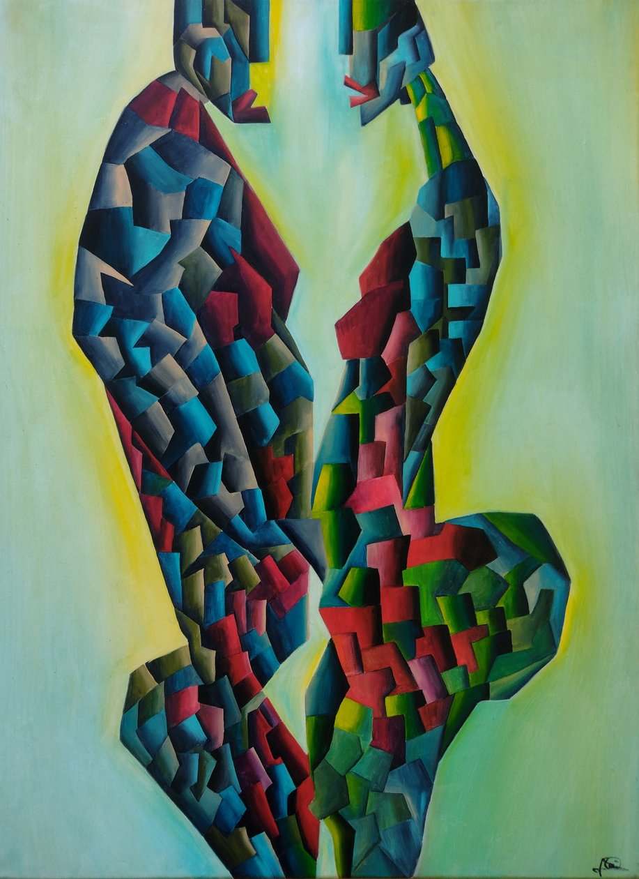Un couple, très proche et pourtant à distance. Des géométries assorties. Les corps se touchent mais les visages sont à distance. Un contact plein d'énergie, révélé par l'éclairage des personnages.