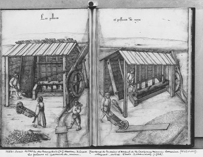 Mine d'argent de La Croix-aux-Mines, Lorraine, fol.17v et fol.18r, lavage du minerai, vers 1530(Silver mine of La Croix-aux-Mines, Lorraine, fol.17v and fol.18r, washing the ore, c.1530 (pen und ink und wc on paper) )Heinrich Gross or Groff |