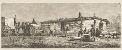 Station de diligence transcontinentale dans le désert de l'Utah, de 'À travers les États-Unis, de l'Atlantique au Pacifique', par Louis Laurent Simonin, gravure par Hildibrand de 'L'Illustrazione Italiana', No 42, 13 août(Transcontinental stagecoach station in the Utah desert, from Across the United States, from the Atlantic to the Pacific, by Louis Laurent Simonin, engraving by Hildibrand from L'Illustrazione Italiana, No 42, August 13)Henri Theophile Hildibrand |