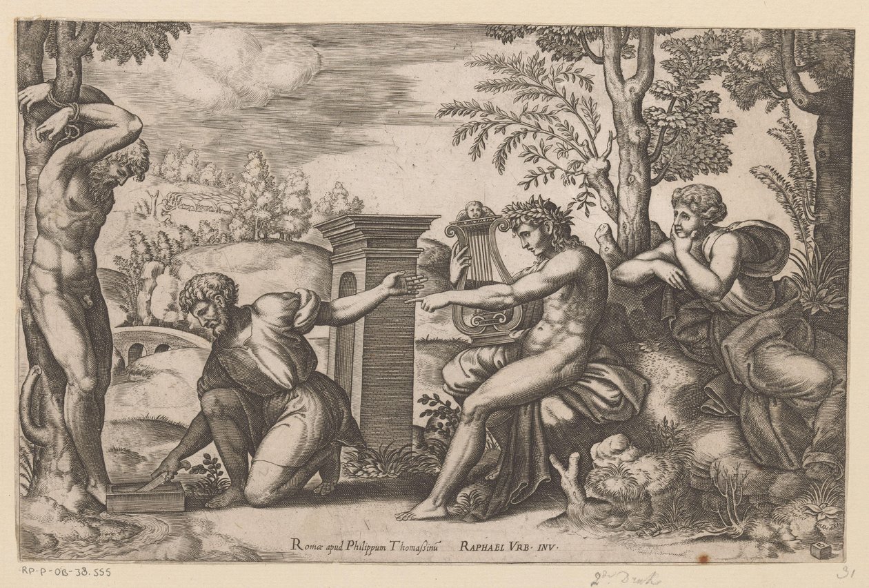 Apollon et Marsyas(Apollo en Marsyas)Meester van de Dobbelsteen(print maker),Rafaël(after design by),Philippe Thomassin(publisher) |