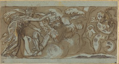 Cérès changeant Ascalaphus en un oiseau de mauvais augure (plume et encre brune avec lavis brun rehaussé de blanc sur papier vergé bleu)(Ceres Changing Ascalaphus into a Bird of Evil Omen (pen and brown ink with brown wash heightened with white on blue laid paper))Paolo Farinati |