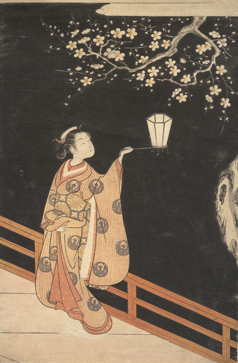 nature · arbre · femelle · femmes · femme · les gens · fleur · fleurs · usine · usines · nuit · pays · fleur · vêtements · musée · couleur · le japon · japonais · éclairage · robe · kimono · endroit · siècle · lanterne · contemplation · habillement · contemplatif · concept · impression · heure · pleine longueur · contempler · intégral · contemplent · prunier · couleur · rencontré · 18ème siècle · dix-huitième siècle · arbres · suzuki harunobu · harunobu · harunobu · suzuki · heritage art · ink and color on paper · plum blossom · Heritage Art/Heritage Images |
