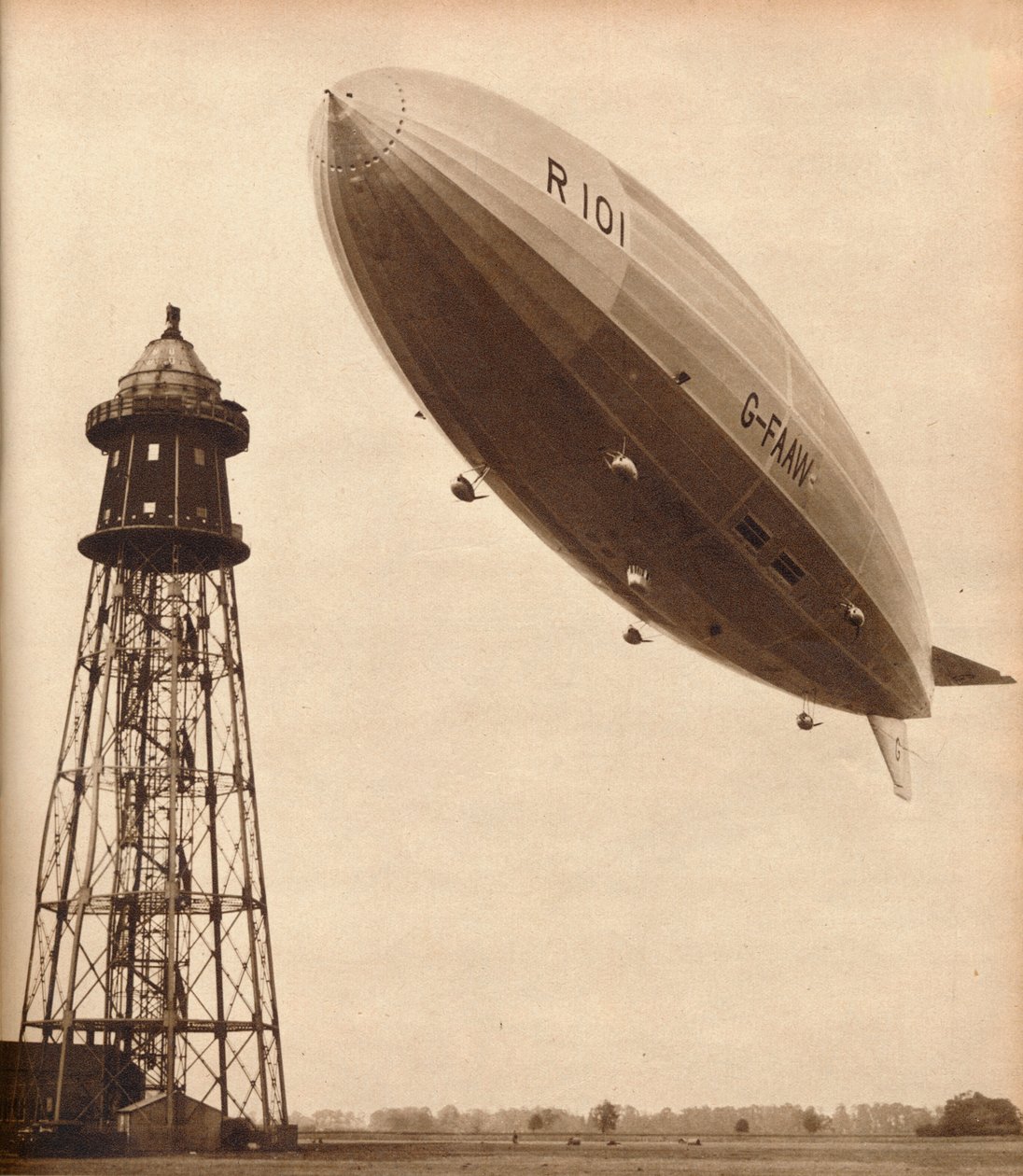 transport · transport · dehors · ciel · tour · jour · britannique · perspective · siècle · empire · la grande-bretagne · journal · sepia · concept · mi air · monochrome · publication · transports aériens · de fond · noir et blanc · noir et blanc · les années 30 · 20ème siècle · dirigeable · dirigeable · r101 · photograph · object · unknown · tremendous years · The Print Collector/Heritage Images