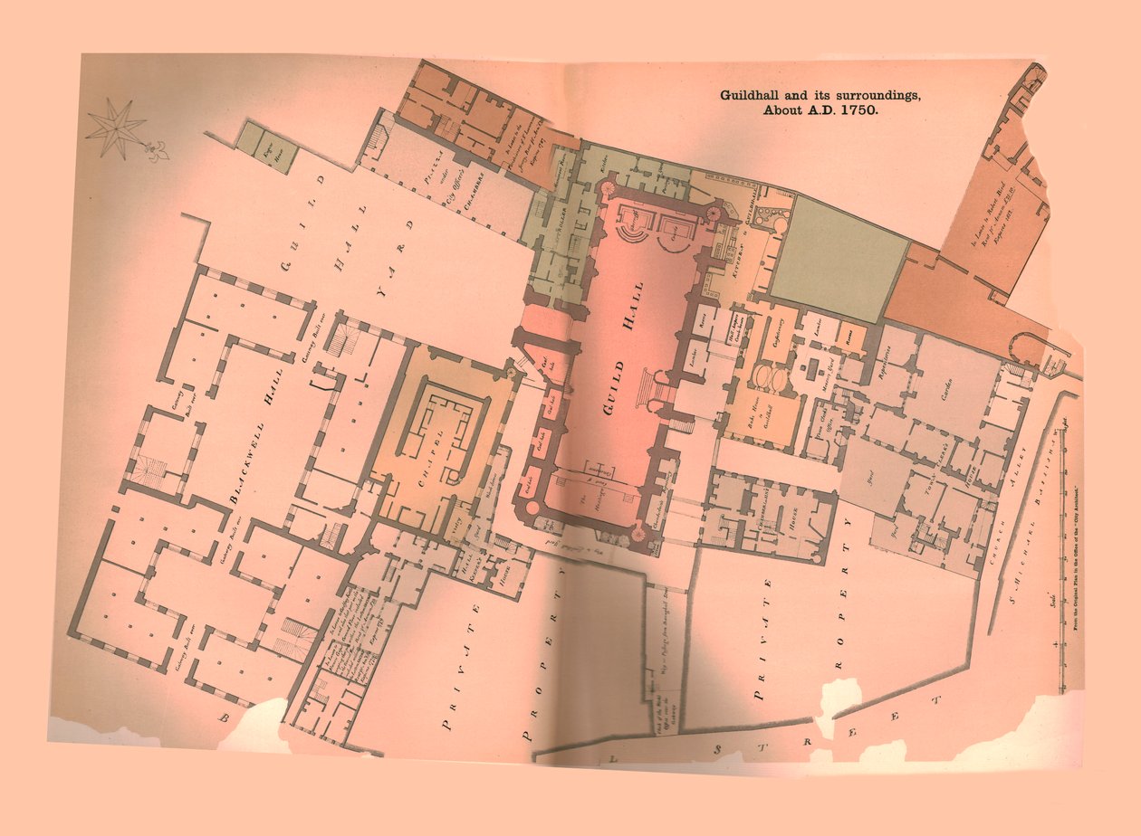 ville · londres · arts · rose · livre · britannique · couleur · couleur · hôtel de ville · endroit · siècle · ville de londres · la grande-bretagne · plan · image · littérature · guildhall · tonalités · 19ème siècle · 18ème siècle · dix-huitième siècle · dix-neuvième siècle · lithograph · listed building · unknown · ground plan · discriptive account of the guildhall · The Print Collector/Heritage Images