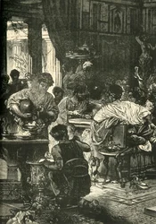 nourriture · boisson · les gens · mâle · intérieur · le travail · homme · hommes · arts · relaxation · pays · rome · détente · livre · type · métier · alcool · abondance · antique · romain · endroit · siècle · conversation · profession · littérature · concept · abondance · divan · conversation · banquet · régal · esclavage · servant · monochrome · esclave · 19ème siècle · noir et blanc · noir et blanc · rome antique · dix-neuvième siècle · domestiques · histoire · historique · engraving · unknown · cassells · edmund · cassell co · edmund ollier · ollier · cassell and company ltd · cassell company · cassell · cassells illustrated universal history · The Print Collector/Heritage Images