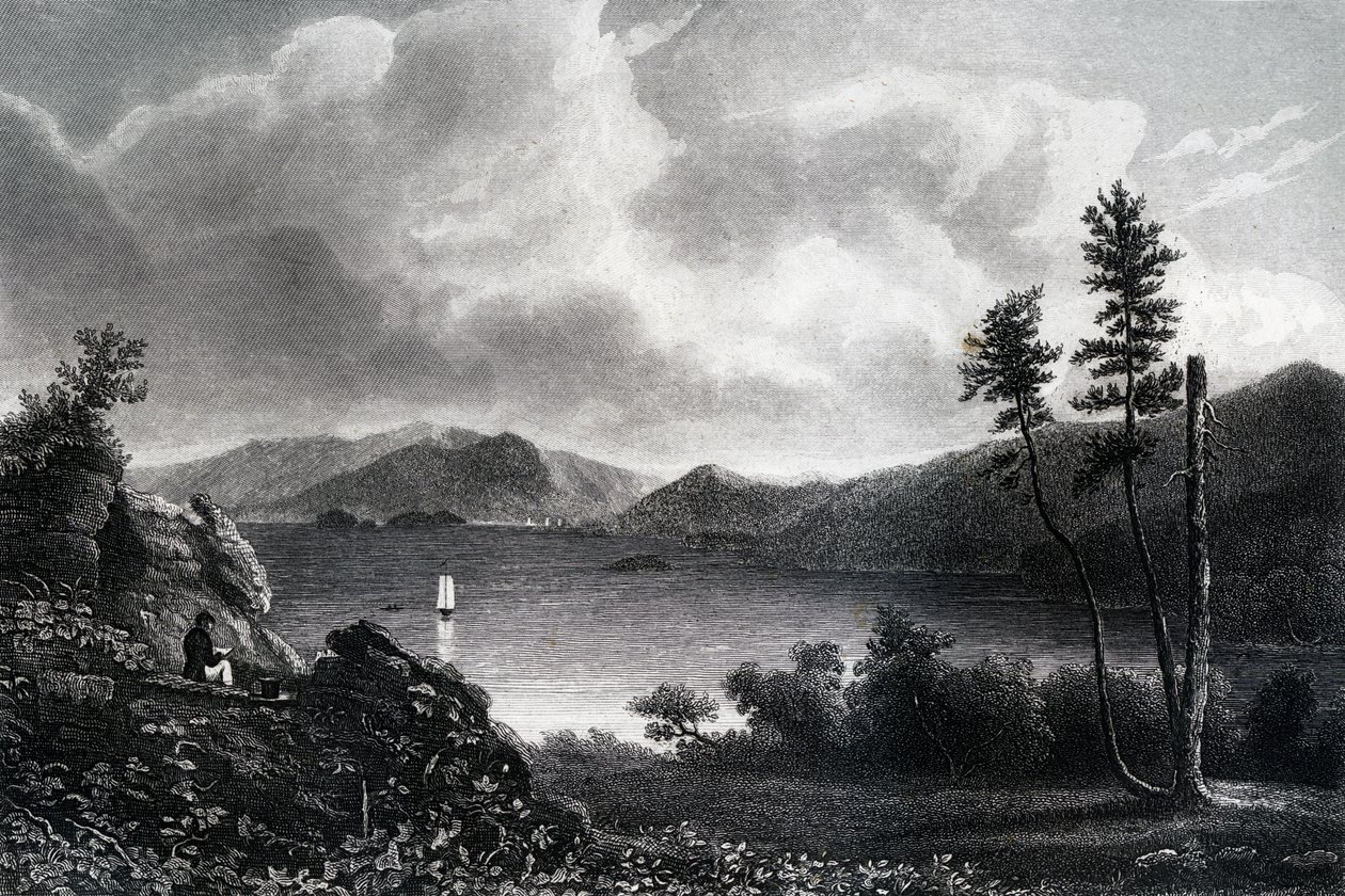 transport · transport · nature · navigation du bateau · bateau · bateaux · pays · géographie · endroit · bateau à voiles · siècle · monochrome · s uni · 19ème siècle · noir et blanc · noir et blanc · lac george · dix-neuvième siècle · américain · les etats-unis · engraving · landscape · unknown · john howard hinton · hinton · john howard · The Print Collector/Heritage Images |