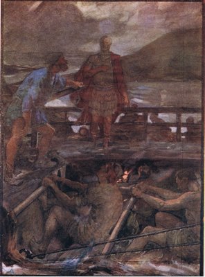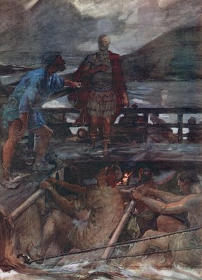 César et le pilote, illustration tirée de "Plutarch's Lives for Boys and Girls", réécrite par W.H. Weston, Londres, vers 1910 (lithographie en couleurs).(Caesar and the pilot, illustration from 'Plutarch's Lives for Boys and Girls', retold by W.H. Weston, London c.1910 (colour litho))William Rainey |